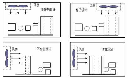 ◆ 減少風道的障礙,以免降低了風量,浪費風扇的功率,尤其在出口及入口是風道最窄的位置,應該預留足夠的風道空間。
